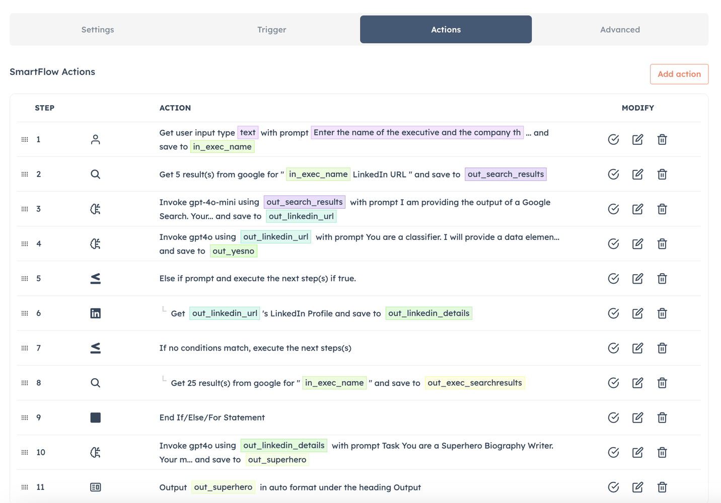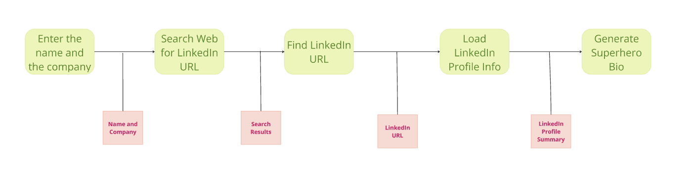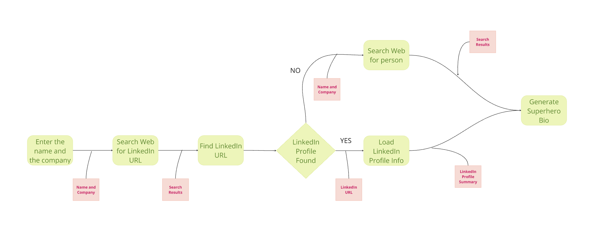 In the above example, we are using the LLM Router (LinkedIn Profile Found - the diamond) to check the output of the action that found the LinkedIn URL and if we found the LinkedIn URL we are routed down the usual path, else we are routed down another path and in this new path we search the web for the person and use the results from the web search to Generate their Superhero Bio.