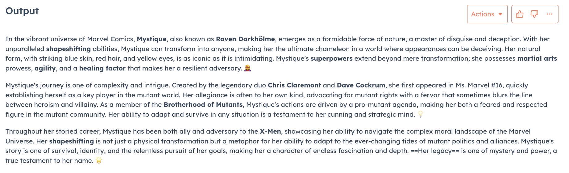 So I decided to test this agent out and what I realized quickly is that it is hard to find real people who don't have a LinkedIn Profile. Here are the people who have LinkedIn profiles - William Shakespeare, Captain America!!! So sticking with the Superhero theme I tried Mystique from the X-Men and here is her Superhero Bio.