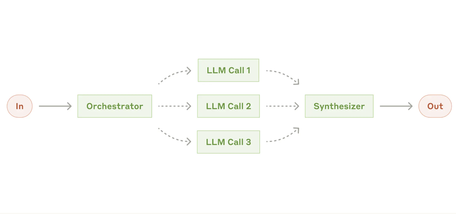 Anthropic does a great job explaining what the Orchestrator-Workers pattern is and this is the first pattern we start moving away from a tradition hard-coded workflow to something that can only be done with an LLM that can reason and plan. While not completely autonomous it start bringing in some autonomy where the agent starts making some decisions on how to route work to and who to route work to.