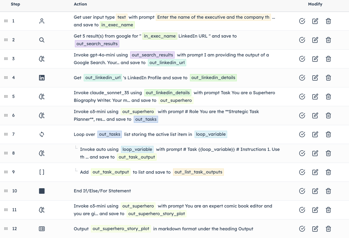 So now that we have got the theory out of the way, how can we apply this pattern to our Superhero story. In my previous example, I had taken the LinkedIn profile of a person and then executed 3 LLM actions that generated -