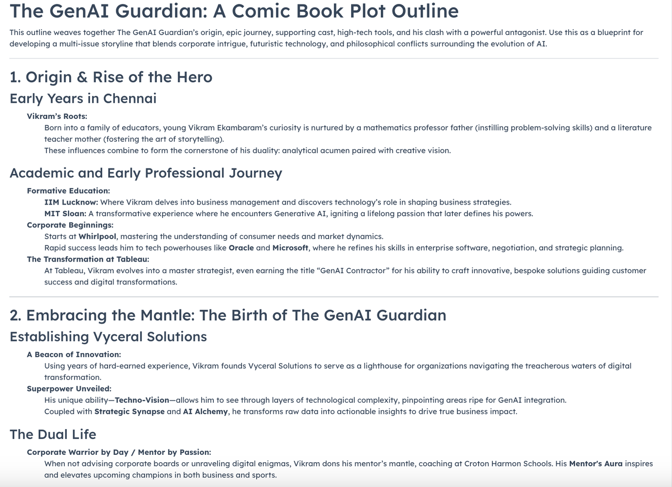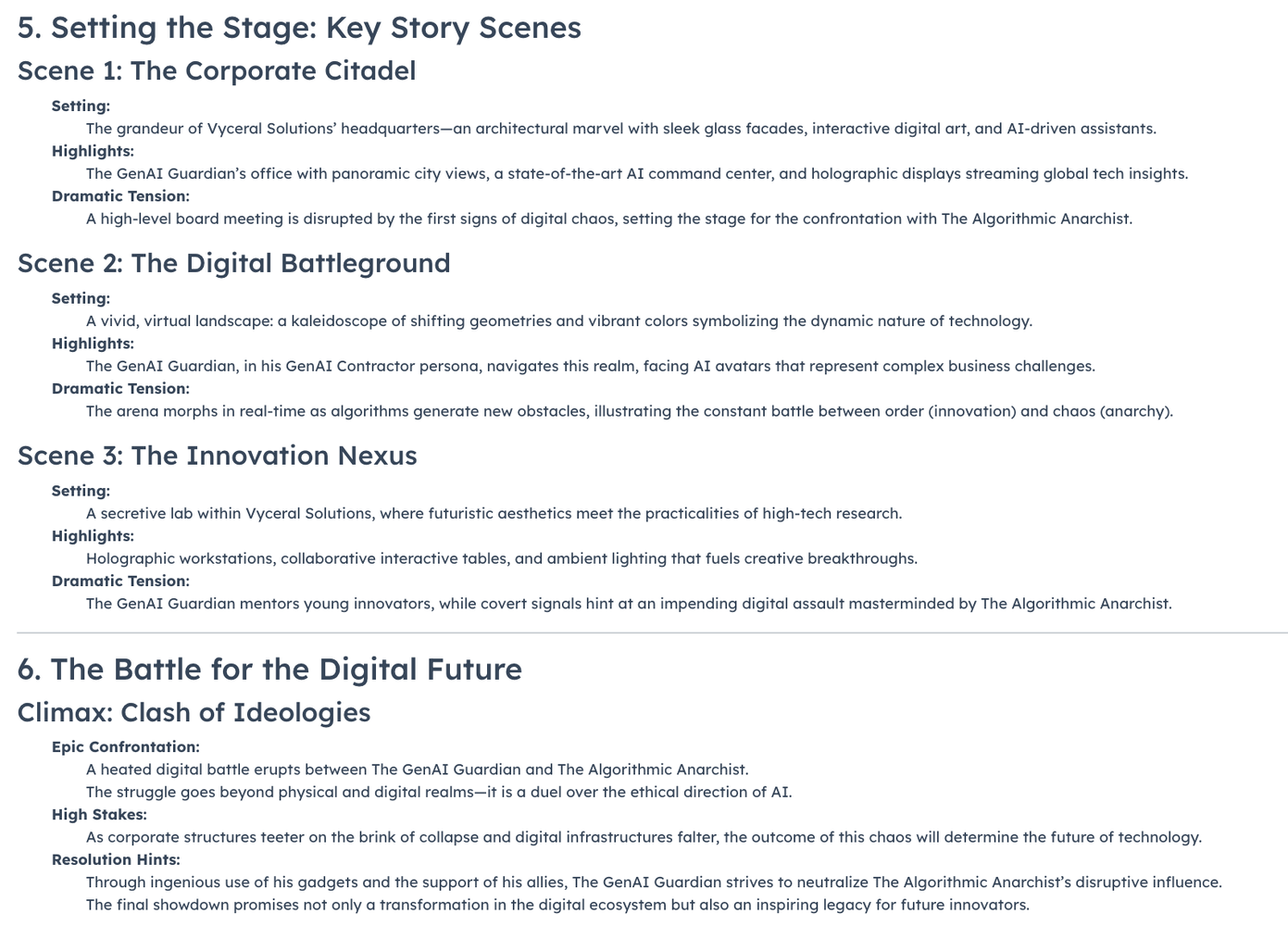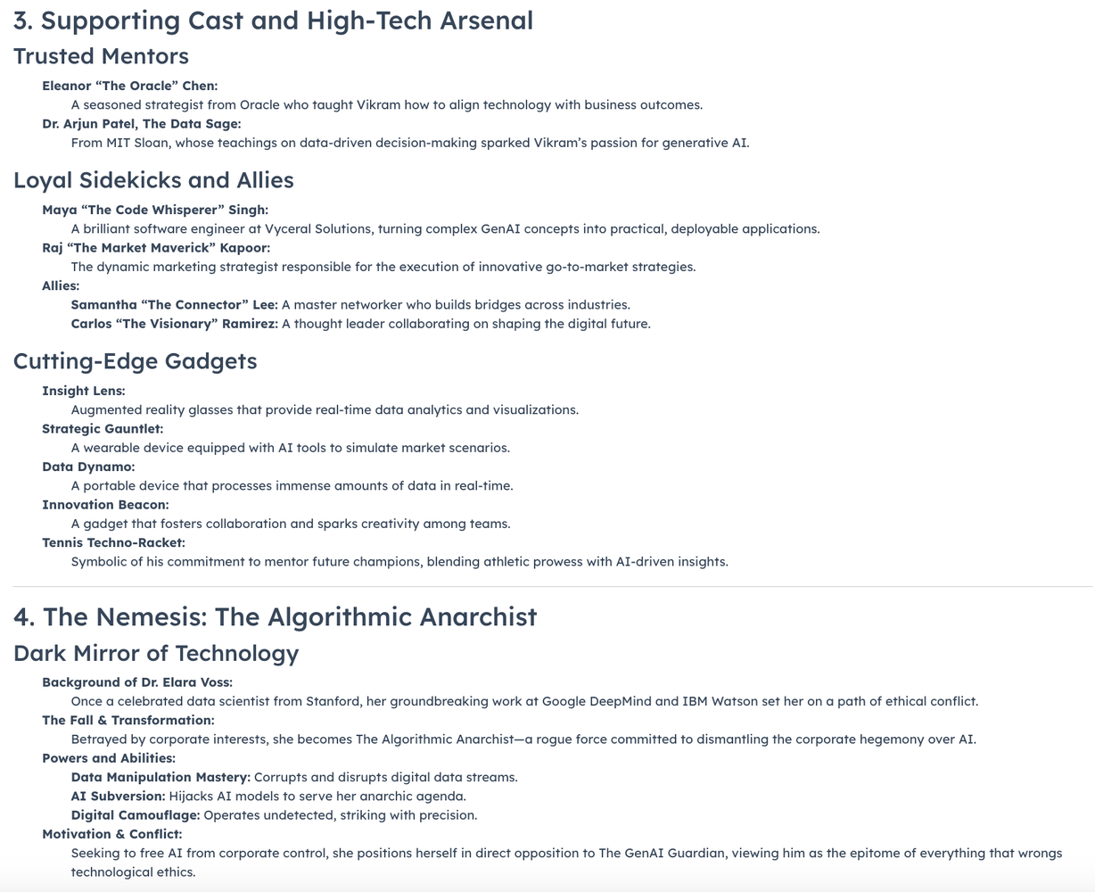 You will notice that it came up with someone to write a background story, someone to design gear, a villain, supporting cast and scene and setting. I did not tell it to do any of this. These are then generated as prompts that are executed later.