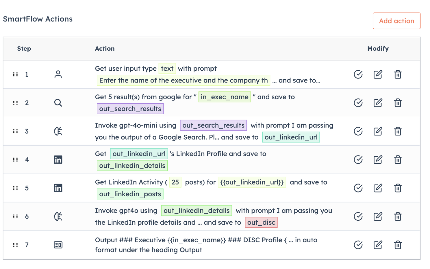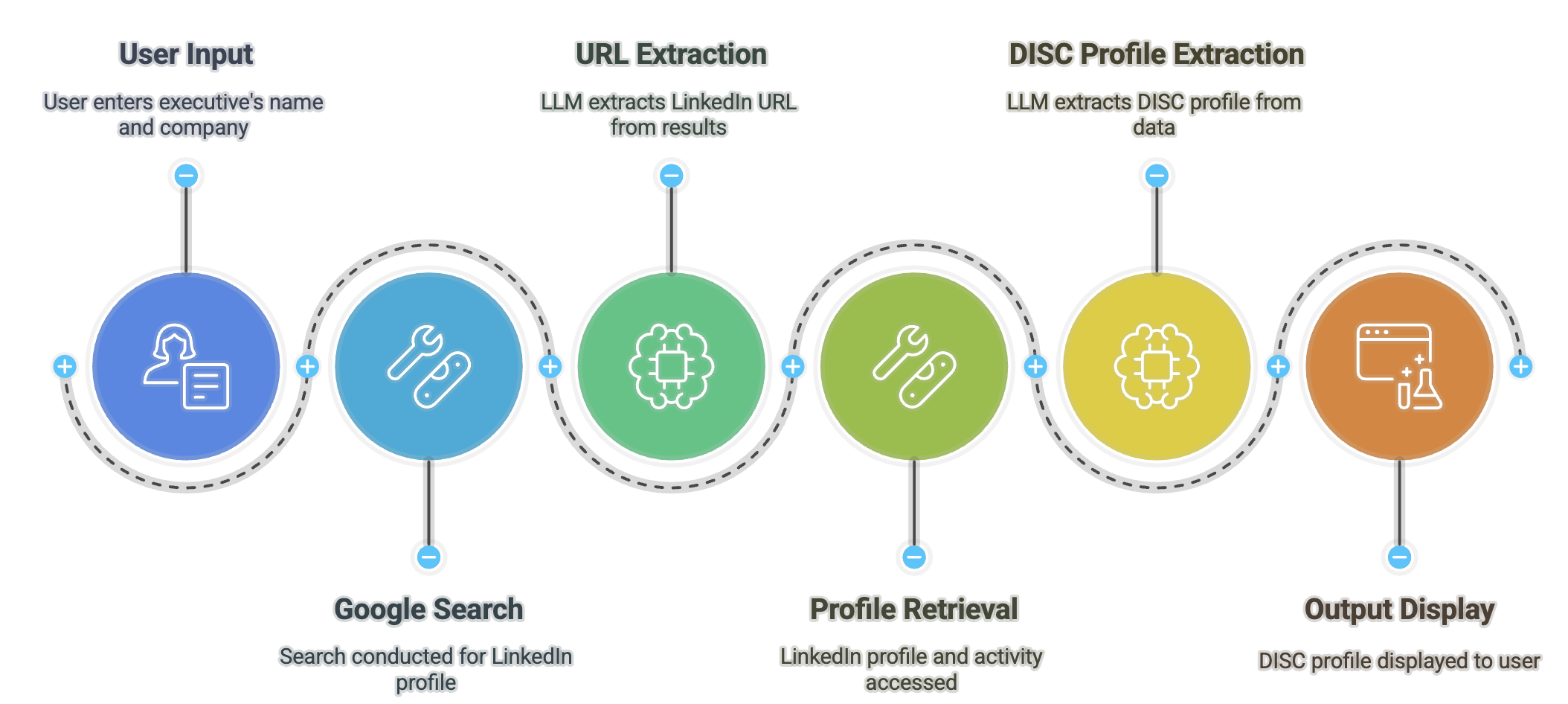 Converting the above to english. I ask the user to enter the name of the executive and the company they work for. I use that to search Google (using the Google Search tool) for their LinkedIn profile, then I use a GPT 4o-mini (LLM) to extract the LinkedIn URL from the search results, then I get their LinkedIn profile (tool) and LinkedIn activity (tool) and pass that to GPT 4o-mini (LLM) to extract their DISC profile and display it in an output.