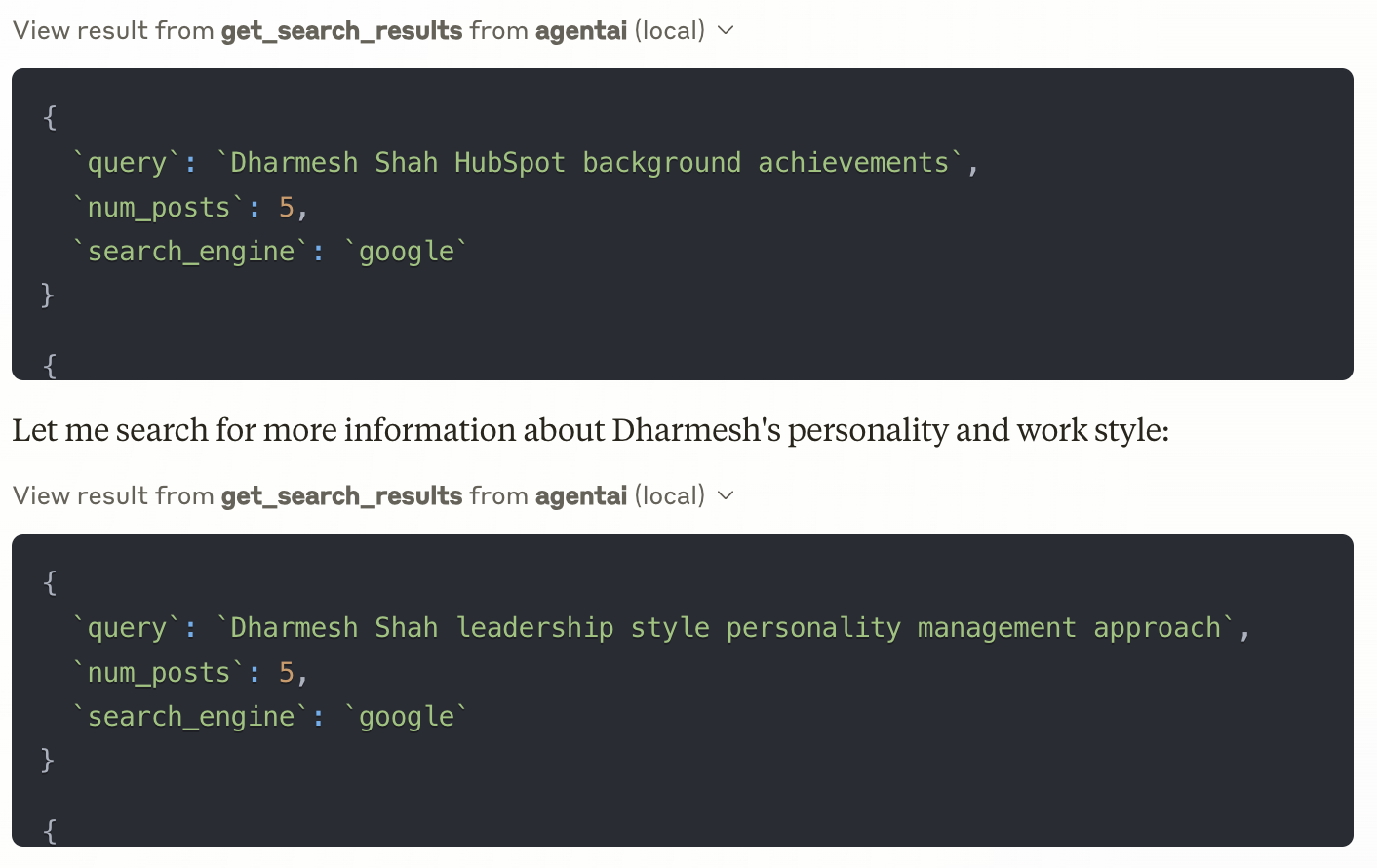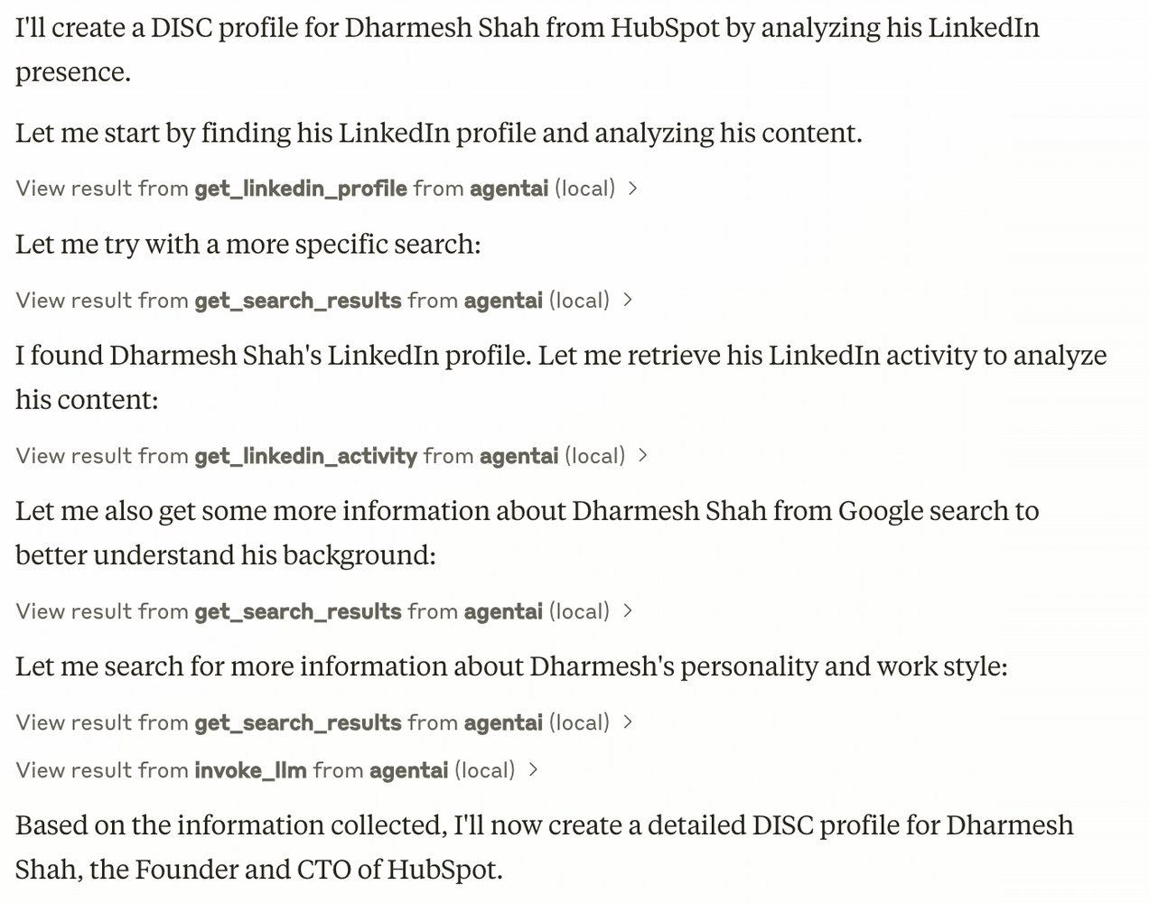 Not only did it use the LinkedIn Profile and Activity, it decided to do a Google search about Dharmesh that it figured out would be useful to generate a good DISC profile.
