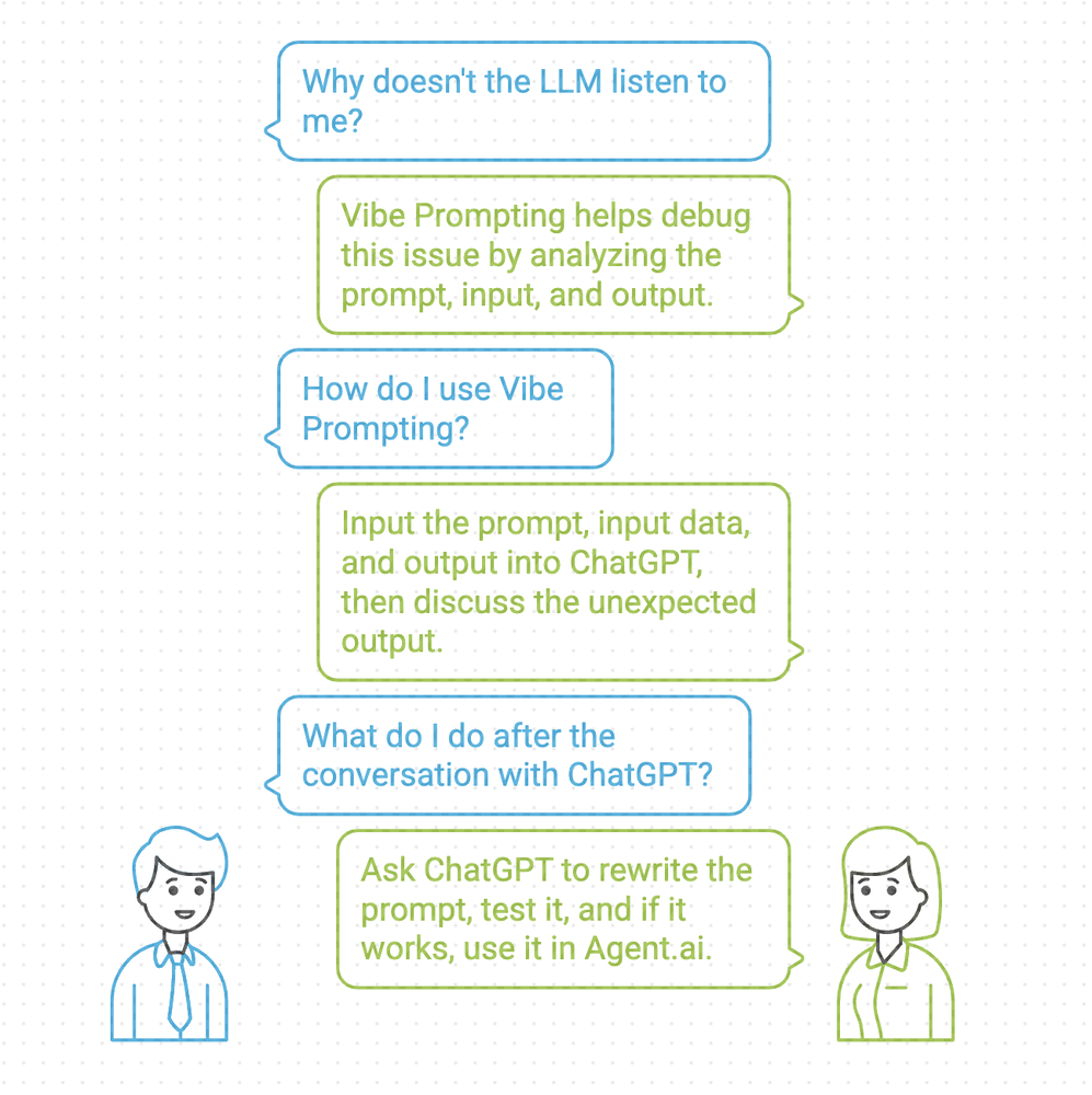 Often you have no idea why the LLM just does not listen to you and this is where Vibe Prompting for debugging is invaluable. The process is quite simple, I take the prompt, the input to the prompt, the output of the execution of the prompt and dump it all into ChatGPT and then have a conversation with ChatGPT on why the output is not what I expected and then ask it to rewrite the prompt to generate the output I want. Then I test it out in ChatGPT and once it looks good I plop it back into Agent.ai