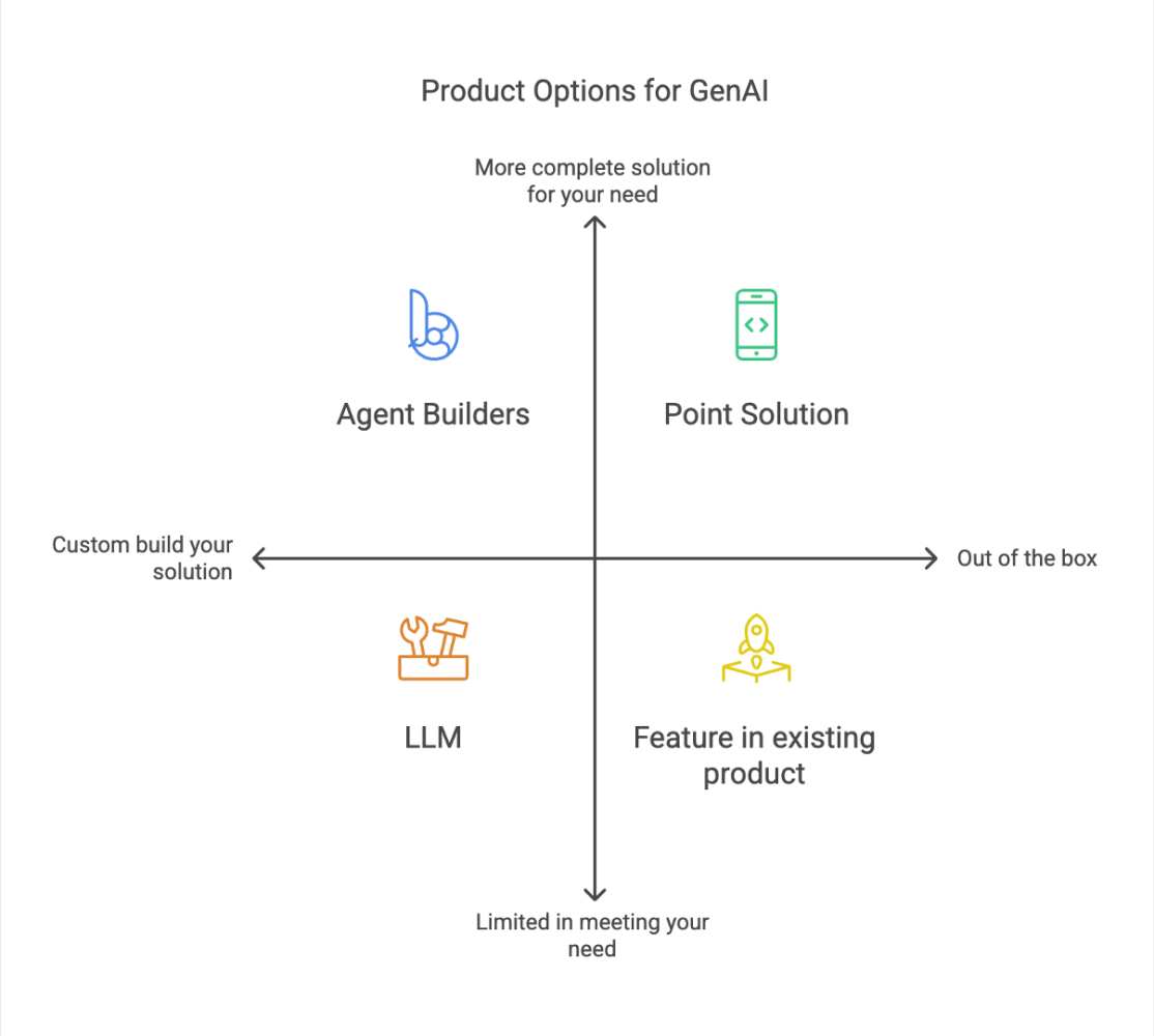I've talked to a lot of companies and almost everyone says they are using Gen AI and they are absolutely correct, but it is not a binary answer. Almost everyone is using ChatGPT but that does not mean they are leveraging Gen AI to the fullest. Some say they are using Gong and even that does not mean they are leveraging Gen AI to the fullest. So I created this visual below to make sense of the various options that companies have when they want to leverage Gen AI.