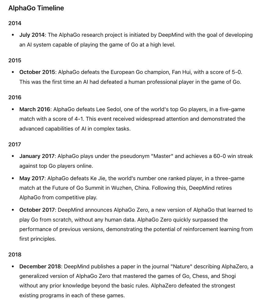 In case you are wondering what all this has to do with the topic of this post, AlphaGo demonstrates this crazy ability to learn and get better. Here is a timeline for AlphaGo.