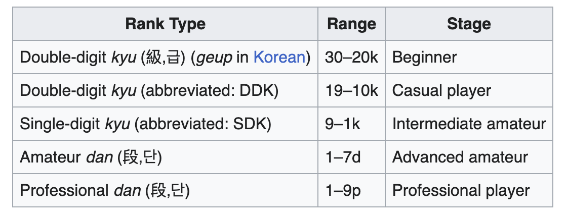 AlphaGo went from a beginner in July 2014 to a 2 Dan in October 2015 to 9 Dan in March 2016. Just for context here is a table with the Dan ranking system.