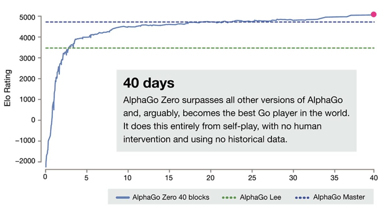 Over the course of millions of AlphaGo vs AlphaGo games, the system progressively learned the game of Go from scratch, accumulating thousands of years of human knowledge during a period of just a few days. AlphaGo Zero also discovered new knowledge, developing unconventional strategies and creative new moves that echoed and surpassed the novel techniques it played in the games against Lee Sedol and Ke Jie.
