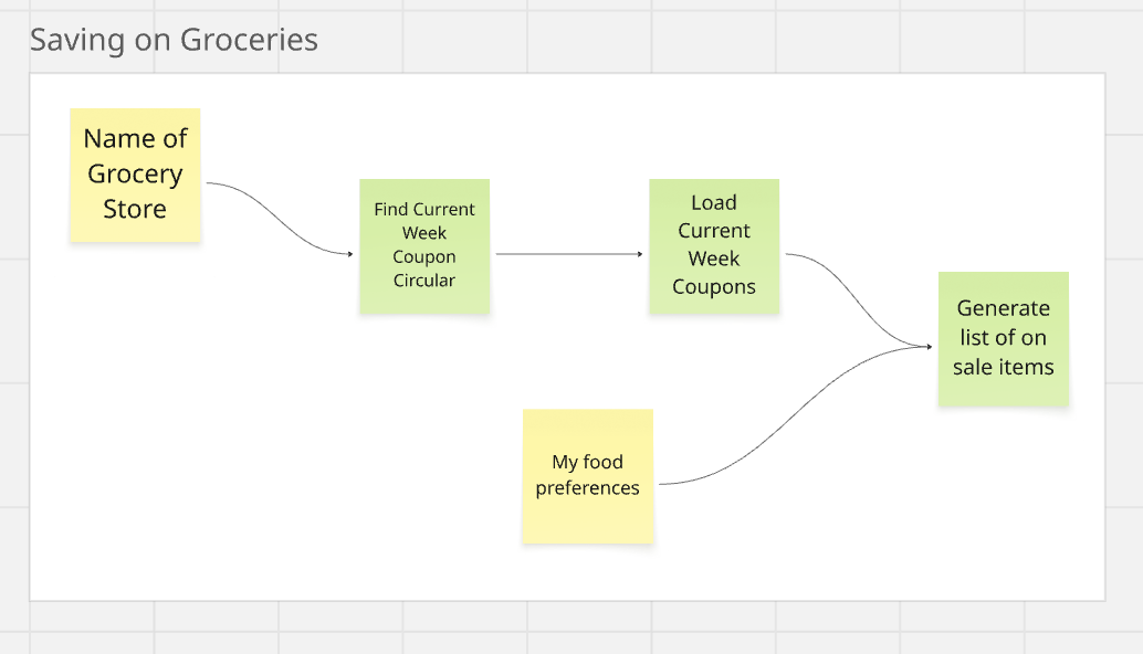 I've been thinking about simple agents that can help regular everyday people save money and thought about an agent that given the name of a grocery store and a person's food preferences, could find the weekly coupon circular published by the grocery store and then recommend a list of items I should purchase.
