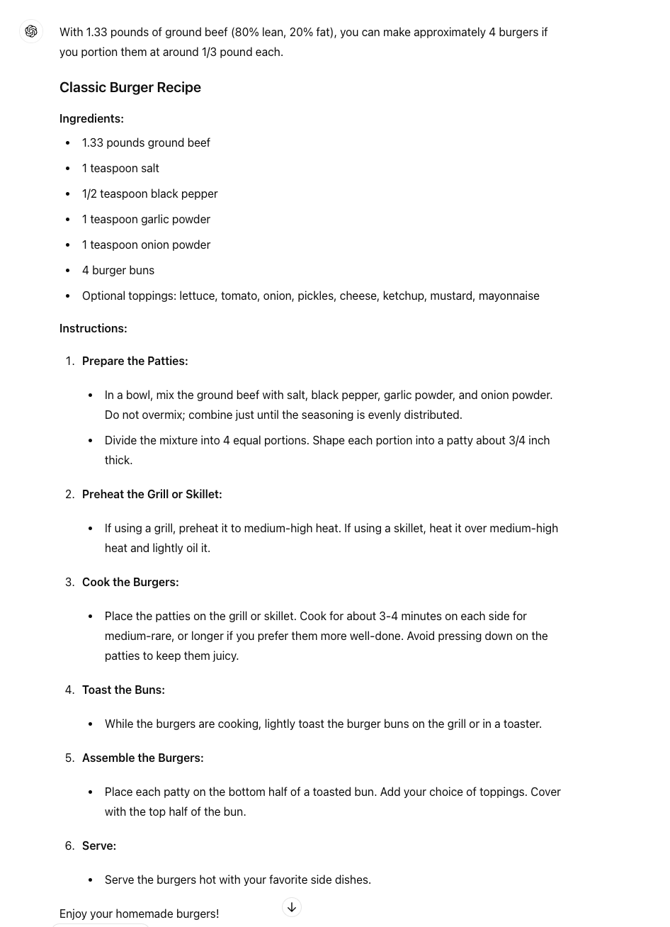 I've been playing around with GPT-4o and was wondering if it could help me cook a meal. As a test I decided to take something I knew how to cook (did not want to have to cook twice in case the experiment went awry). I was planning to grill burgers and wanted to see how GPT-4o could help with this.