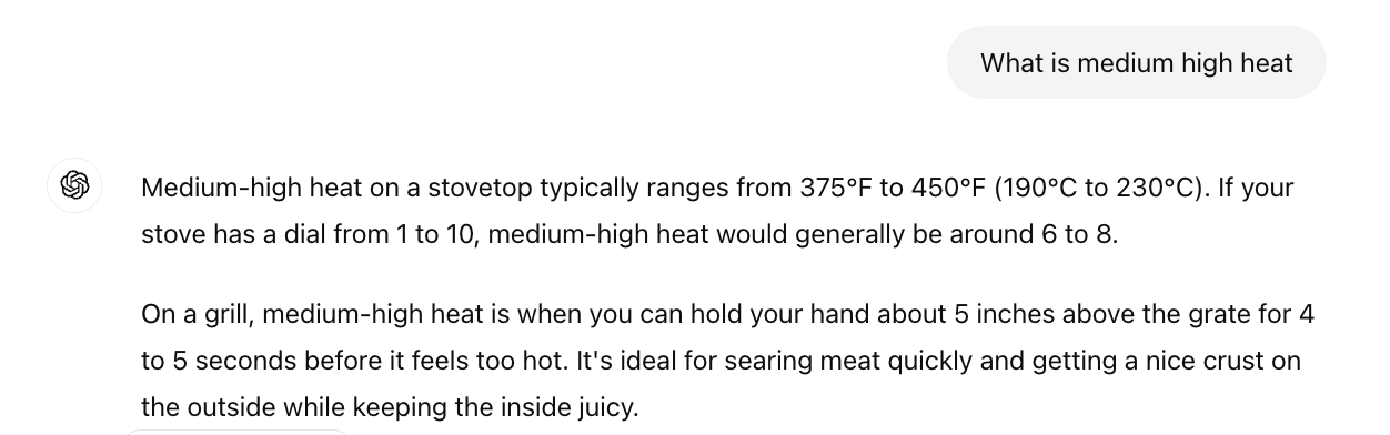 I've always wondered what Medium High heat is and so asked it to clarify that (should have been specific in my prompt that I was using a grill and not a stove top).