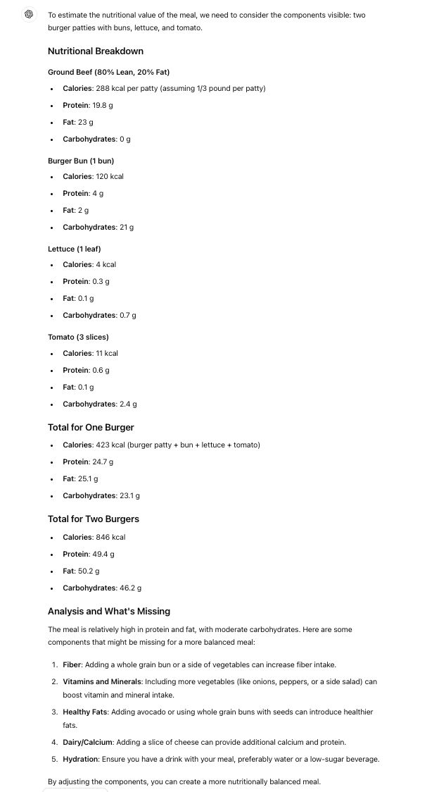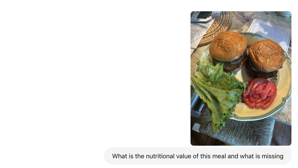 My son plays a lot of tennis and is doing a tennis camp and his coach wants him to increase his protein intake as he needs to build up some muscle and eat healthy. So I decided to take a picture of his meal and ask GPT-4o what the nutritional value of this meal was and if he was missing anything. These are the kinds of questions we have but in the past would have been hard to do.