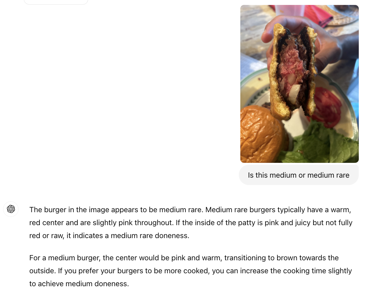 The last question was whether the burger was medium or medium rare. I tend to overcook burgers but always hear that medium rare is the way to go. So I asked GPT-4o for it's opinion and I had cooked a medium rare burger (I think next time I will go back to medium).