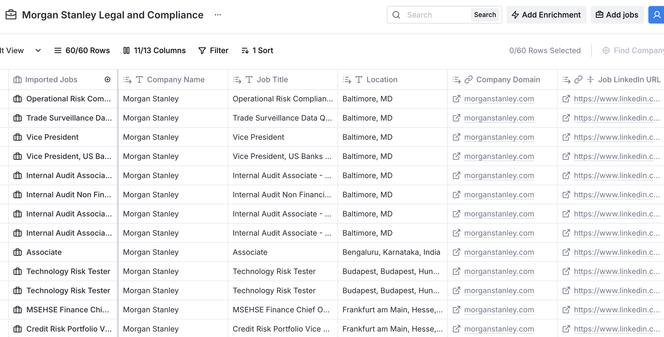 The process I followed was to use Clay to generate the list of jobs. This is super super easy and took about 5 mins to get a list of jobs. I looked for Jobs at Morgan Stanley in Legal and Compliance. It came back with 60 jobs.