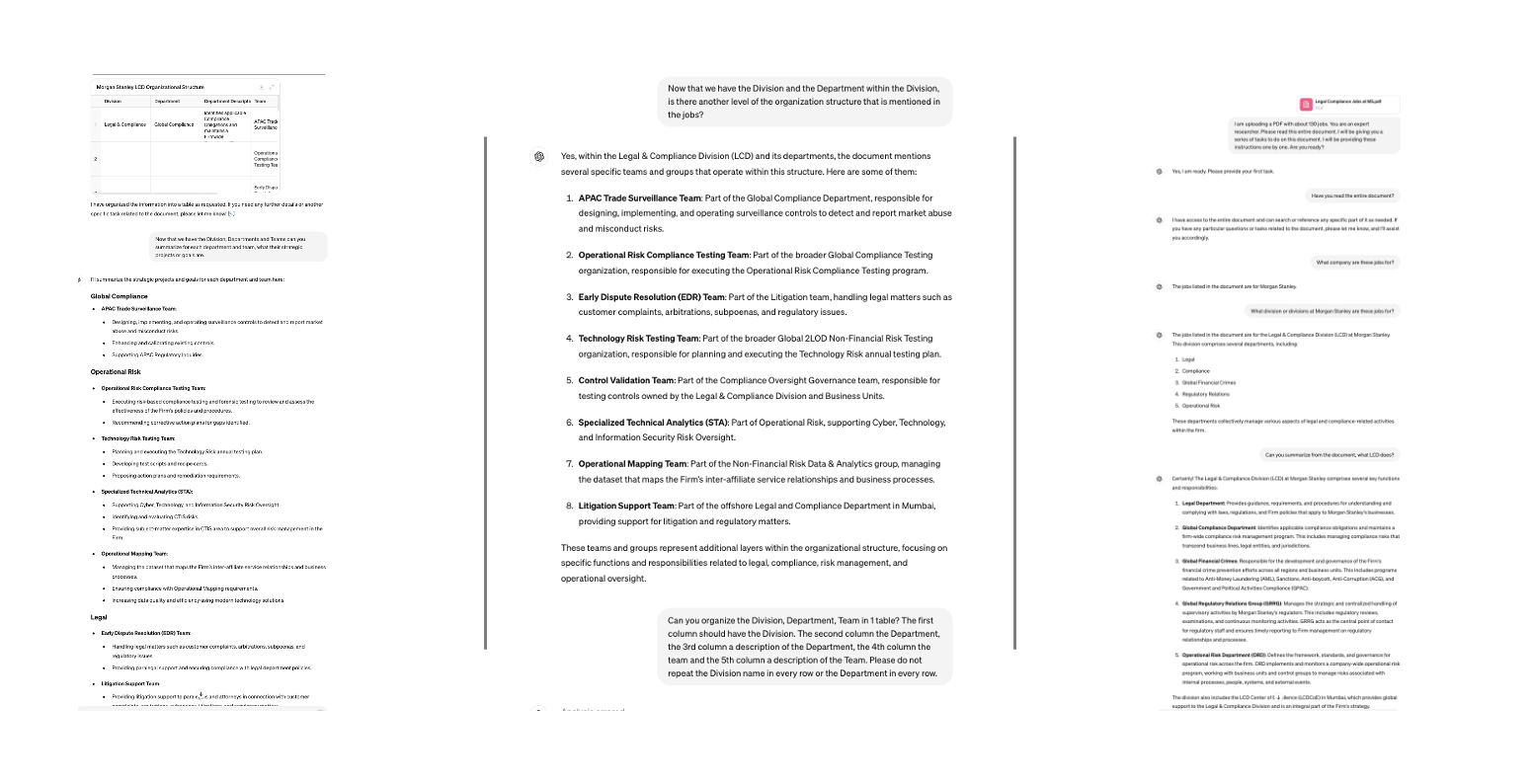 Now that I had a PDF with 60 job listings, I put this into ChatGPT and asked it my series of questions via a series of prompts. This took about 5 minutes and I had all my answers.