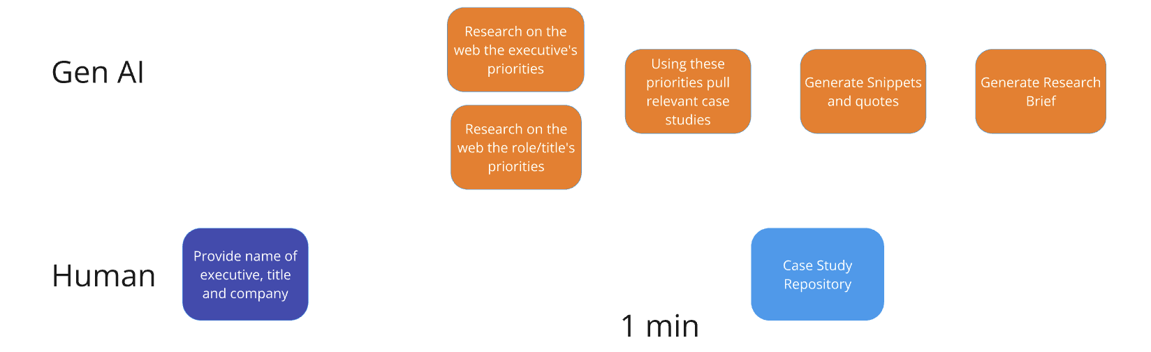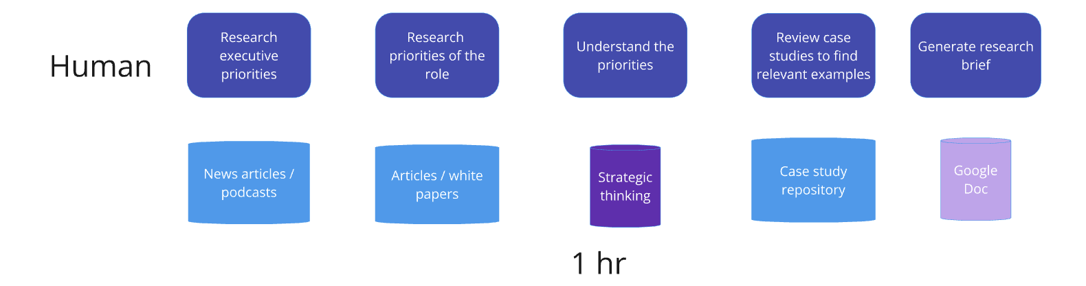 So firstly, this is not as simple as just putting all the case studies and research into a prompt and have it run. There are 4-5 different prompts that need to be orchestrated to generate this output and each of them needs a different input.