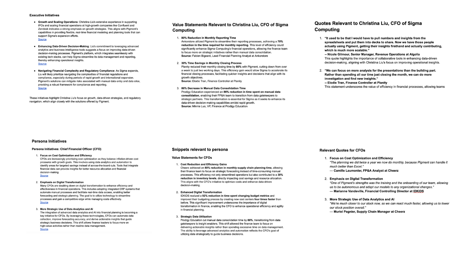 So to put this to the test here is the scenario I chose. I am a rep from Pigment (a bunch of my Tableau friends are there) and I am selling to the new CFO at Sigma Computing (a bunch of my Tableau friends are there). Btw.. both are private companies, so there is limited public information available. Here is what I did -