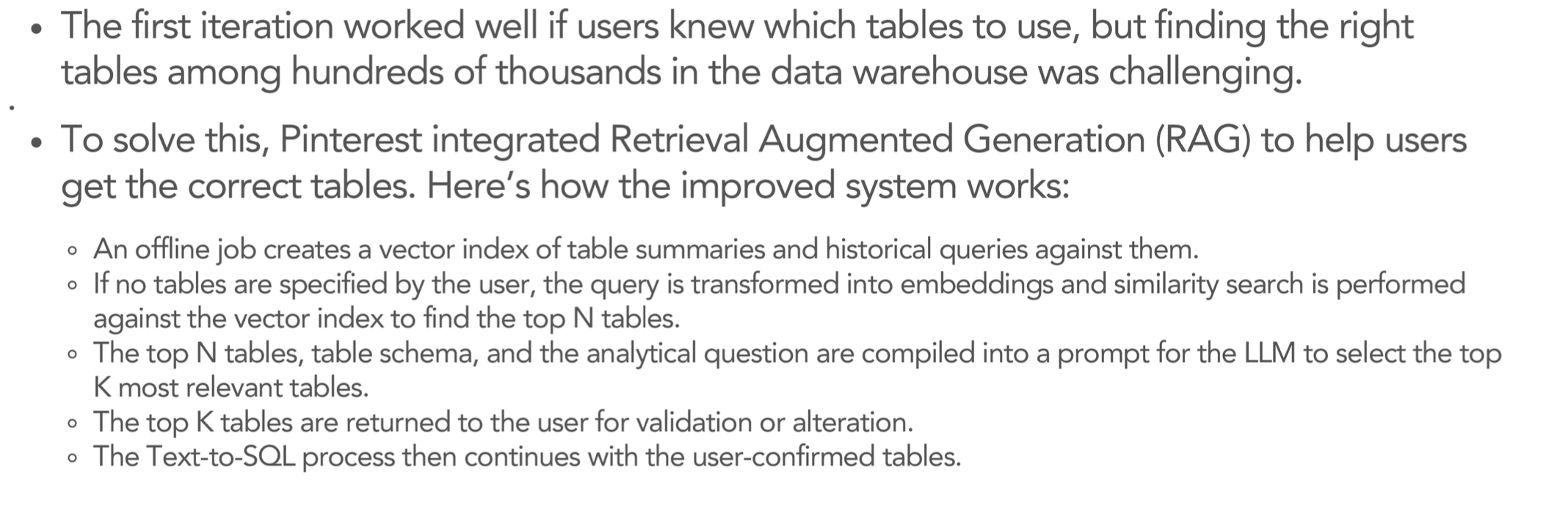 I came across a case study on how Pinterest was using GenAI to do Text to SQL, written by Lewis Walker ➲ that was quite illuminating. They talked about how they went from 40% accuracy to 90% accuracy by moving from just LLM to LLM + RAG. For those interested, here are a couple diagrams that talk about their approach.