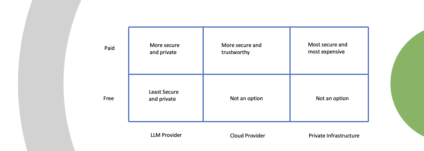 Top Right - If you want even more security, you can deploy your own open source LLM (Llama from Meta or Mistral). This will require you to have technical resources to set these models up, manage the hardware etc. So this is not a trivial decision.