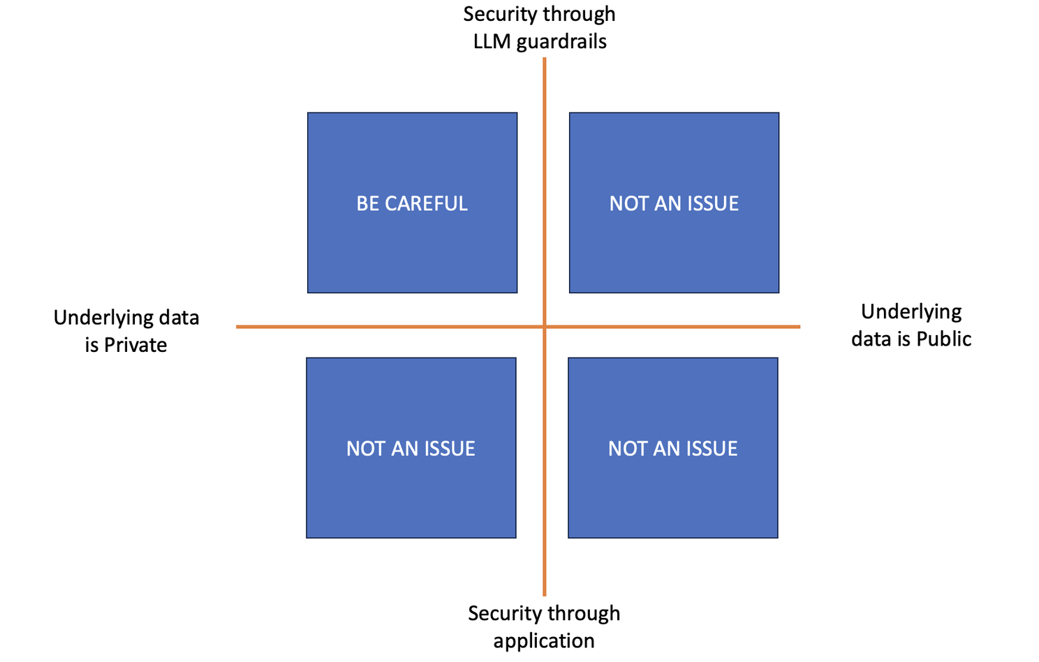 Control the security through the LLM via prompt guardrails. Let us say that I've built an application that allows users to ask questions off of a knowledge base of documents. I've uploaded all documents (including some sensitive ones about performance reviews that I only want some people to view). If I am implementing this security in my prompt, then this opens up security issues via prompt injection. Basically someone can add stuff to the prompt that could go around my security guardrails and potentially get access to this data. There are examples of this and people will keep trying to get around any guardrail based limitations.