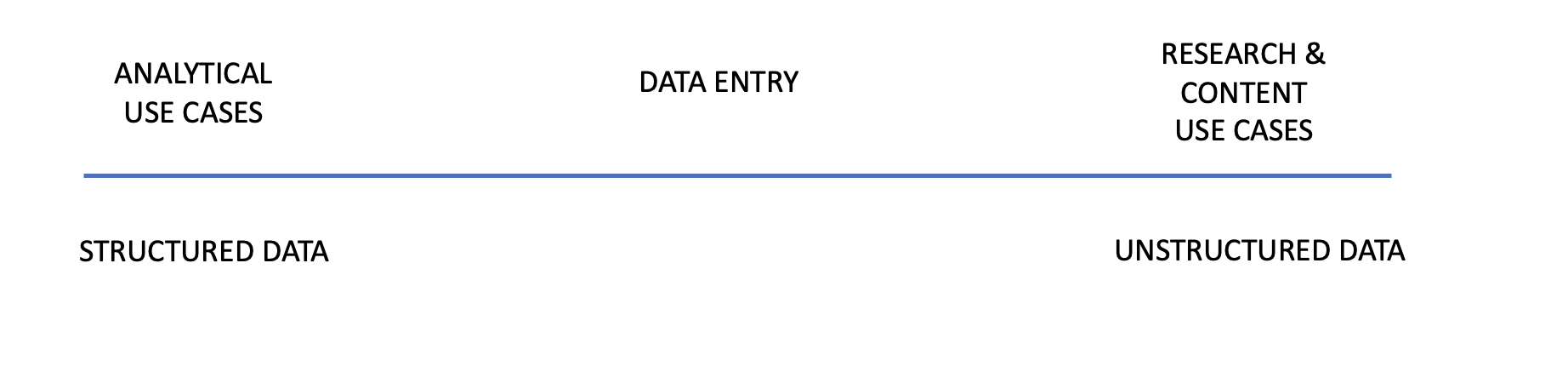 Looking at this another way, with structured data we often deal with Analytical use cases and with unstructured data we often deal with Research and Content Generation use cases. There is another use case, that falls in the middle which is entering unstructured data into structured data sources (e.g. updating a notes filed in a CRM etc.). Below is a simple visual that represents this.