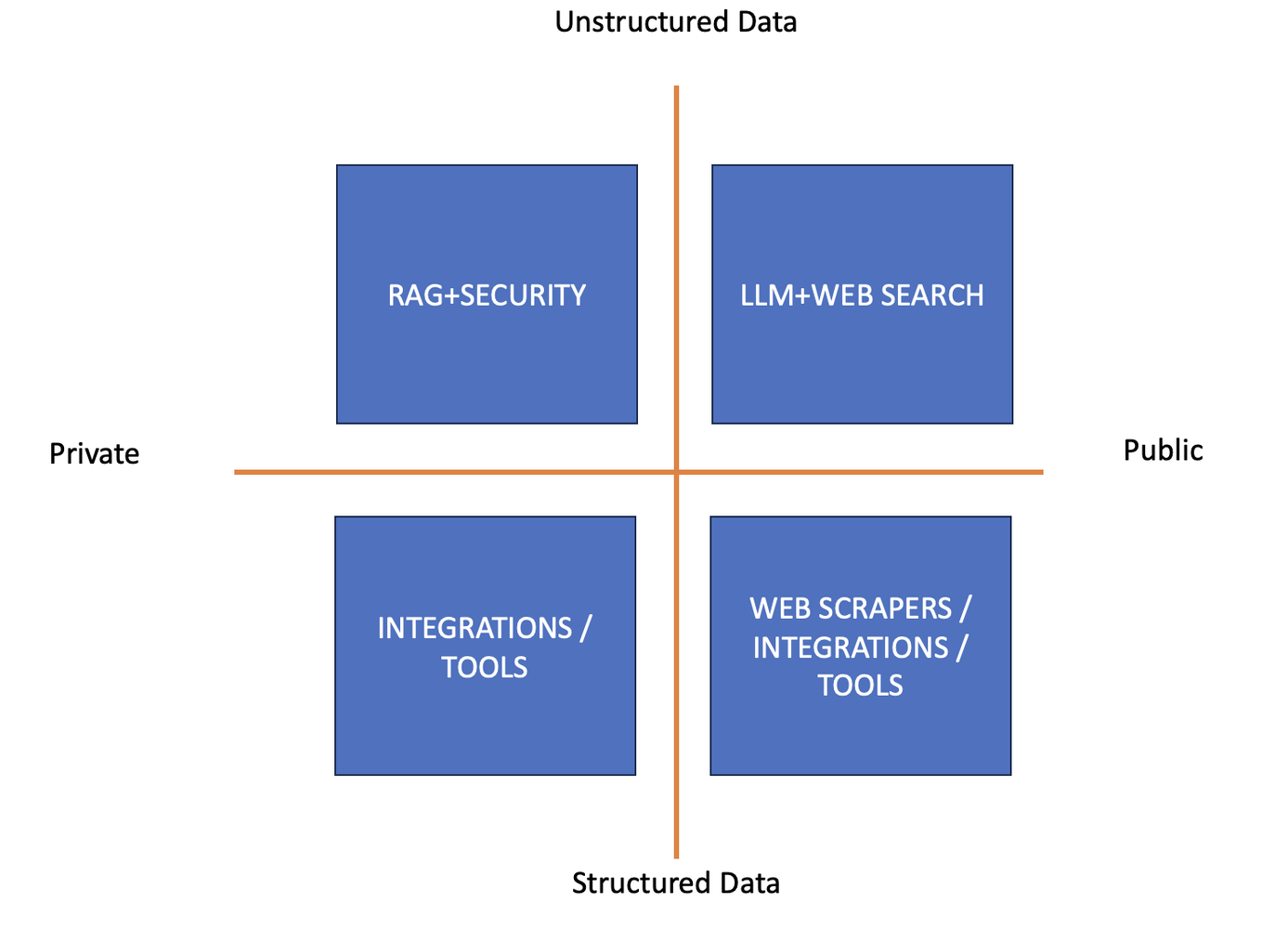 HARDEST : If your use case is a combination of public and private data and is a combination of structured and unstructured data, this will require a lot of thought and effort. Examples, like Klarna using GenAI to automate a lot of their support process are out there, but will take a lot of time, effort, setting up guardrails etc.