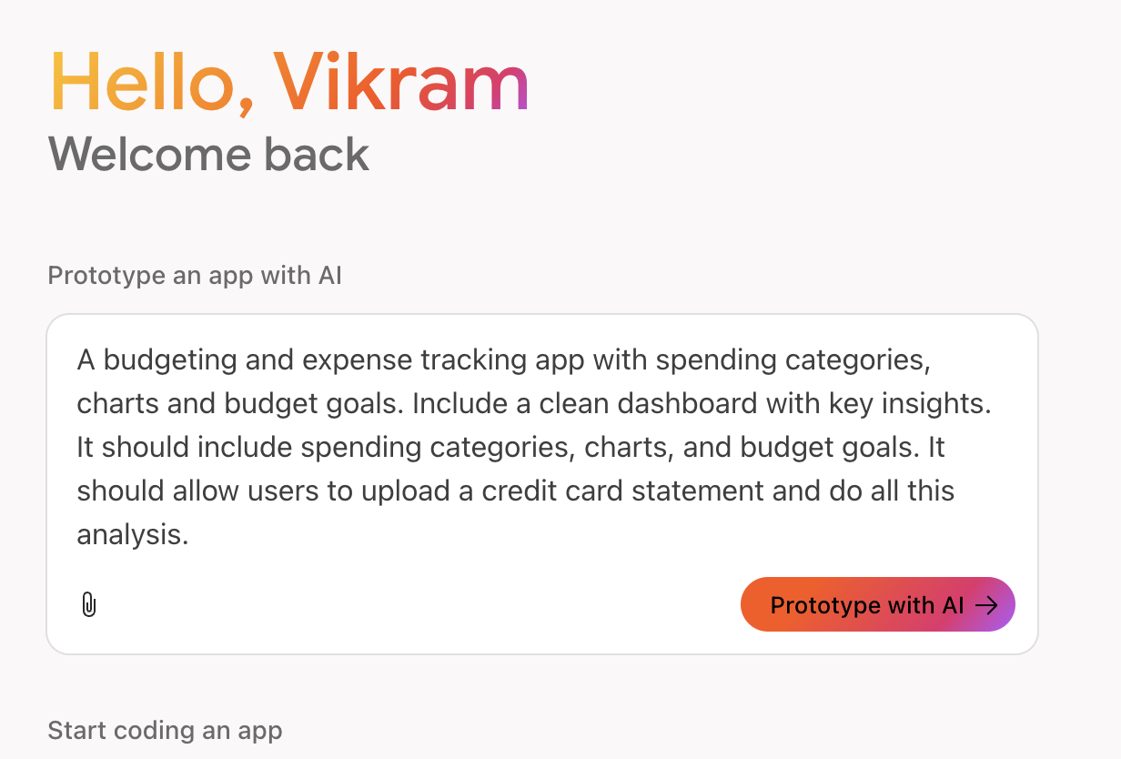 I decided to build an expense tracker app that takes a credit card statement as input and then it will analyze and categorize and analyze all the data. Seems simple enough. So I gave Firebase Studio my prompt (you can see this below).